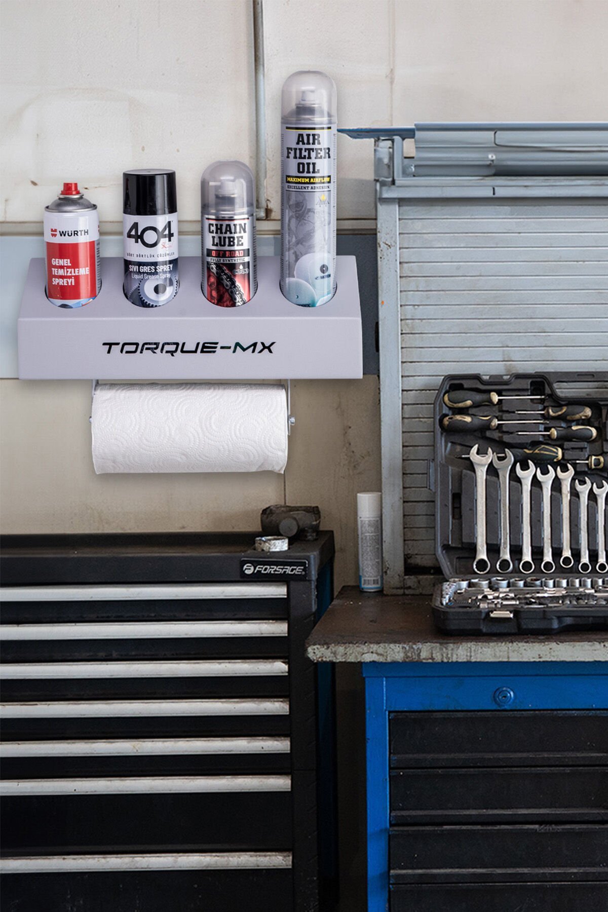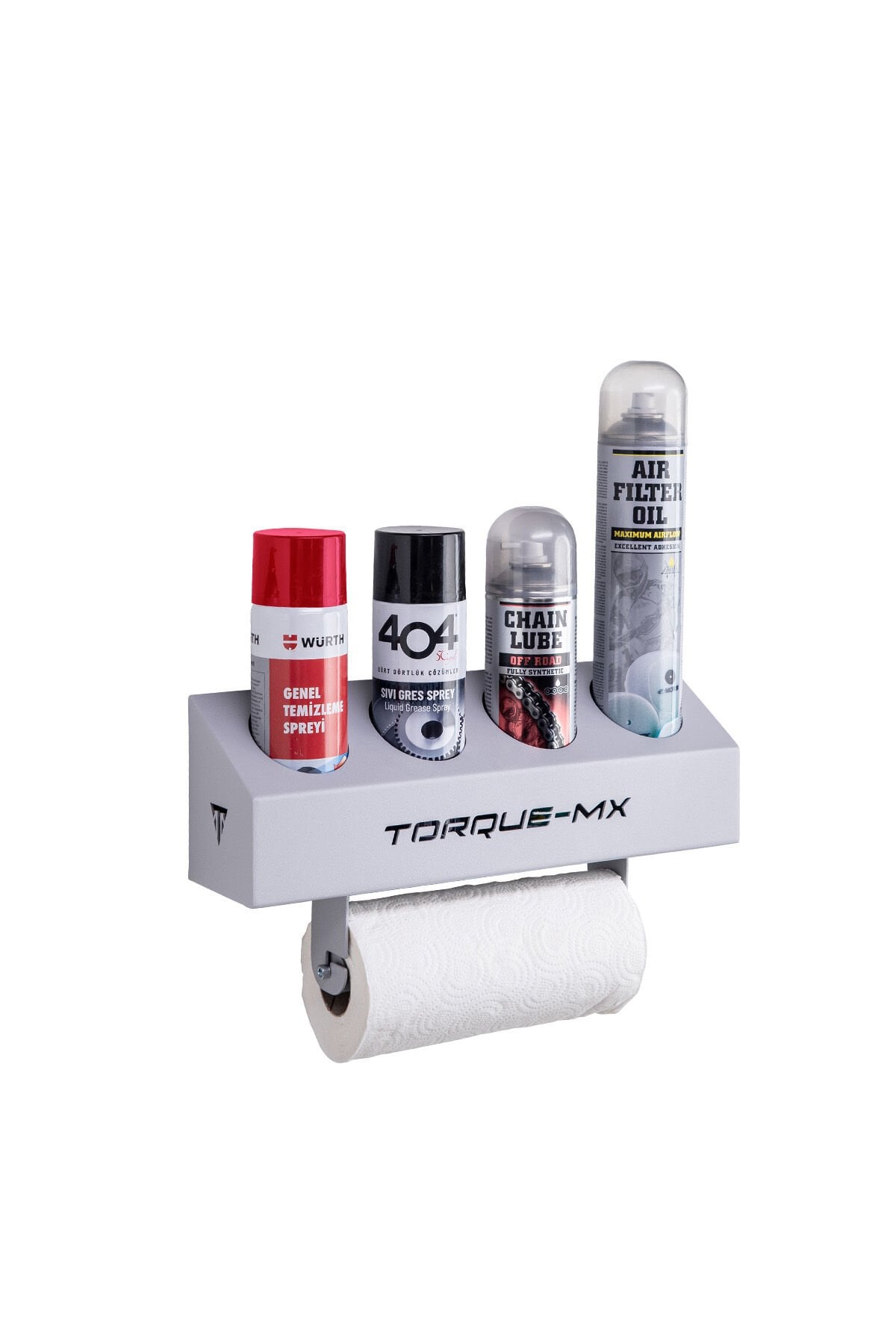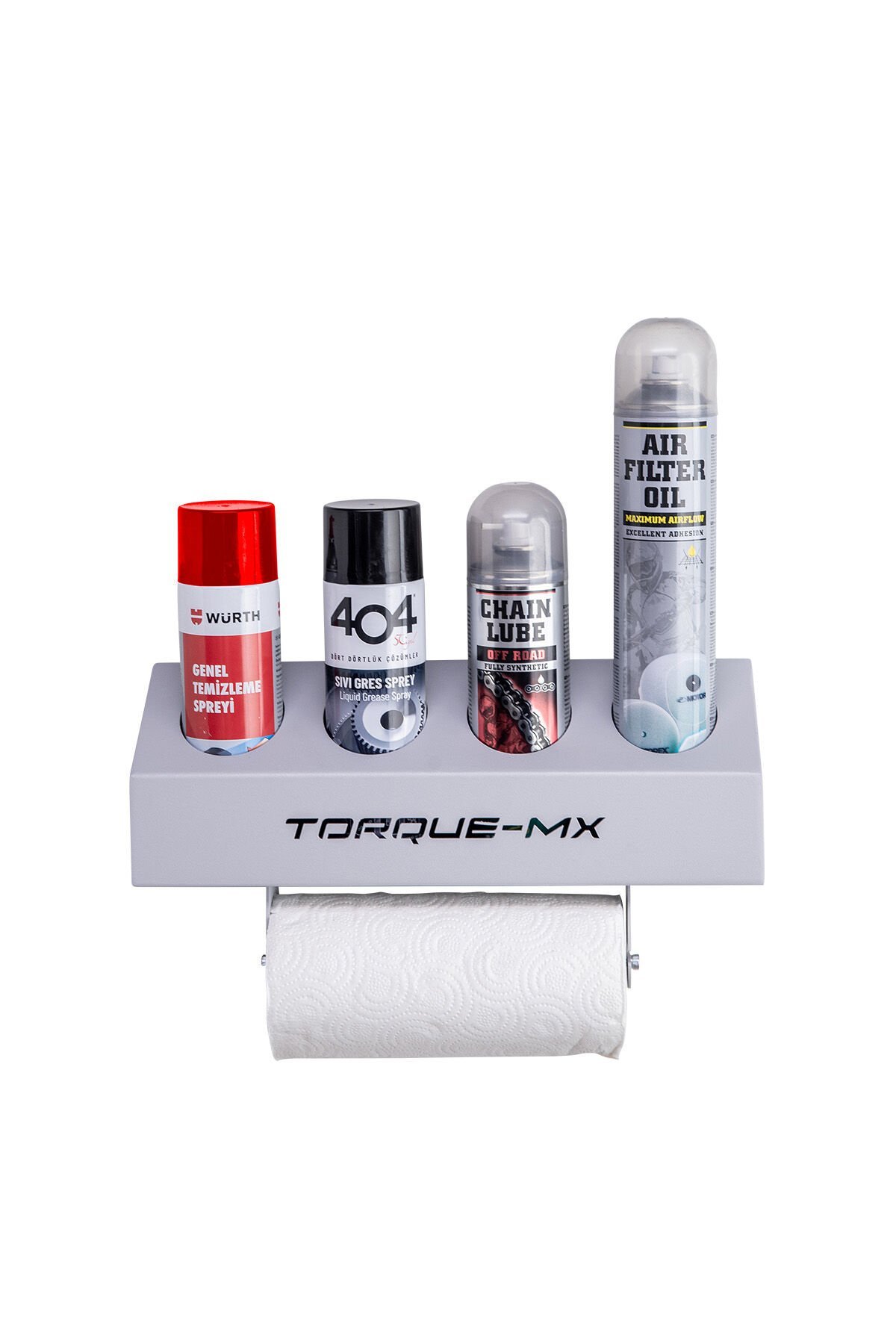 Torque-MX garaj alet düzenleyici, bakım ve onarım çalışmalarında yağ kutuları ve spreylerin düzenli ve erişilebilir olmasını sağlar. Römorklar, panelvan araçlar, tamir atölyeleri, motor garajları ve evde kullanım için mükemmel bir seçenektir. Alt kısmındaki pratik peçetelik, temizlik işlemlerini daha kolay hale getirir.