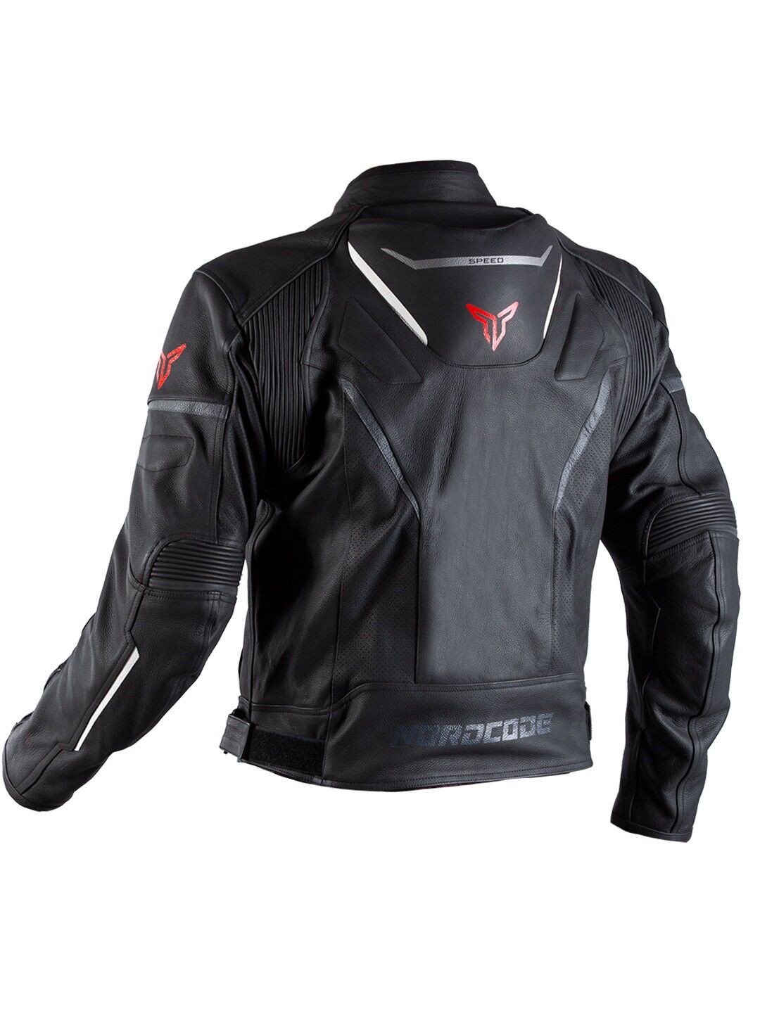 Spor motosiklet deri ceketi, çıkarılabilir termal astar ve küçük aerodinamik kambur ile birlikte.